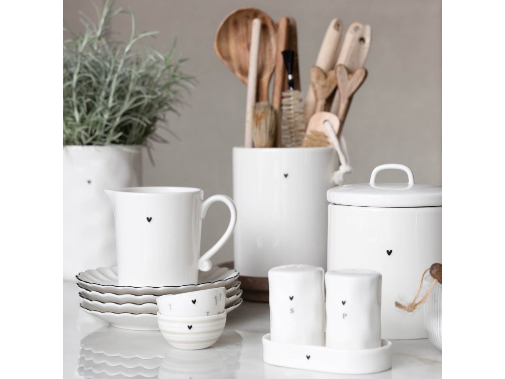Tato prostorná keramická dóza kombinuje funkčnost s minimalistickou estetikou, typickou pro značku Bastion Collections. Čistá bílá barva s typickým srdíčkem pro kolekci a jednoduchý tvar umožňují snadné sladění s ostatními doplňky ve vaší kuchyni.