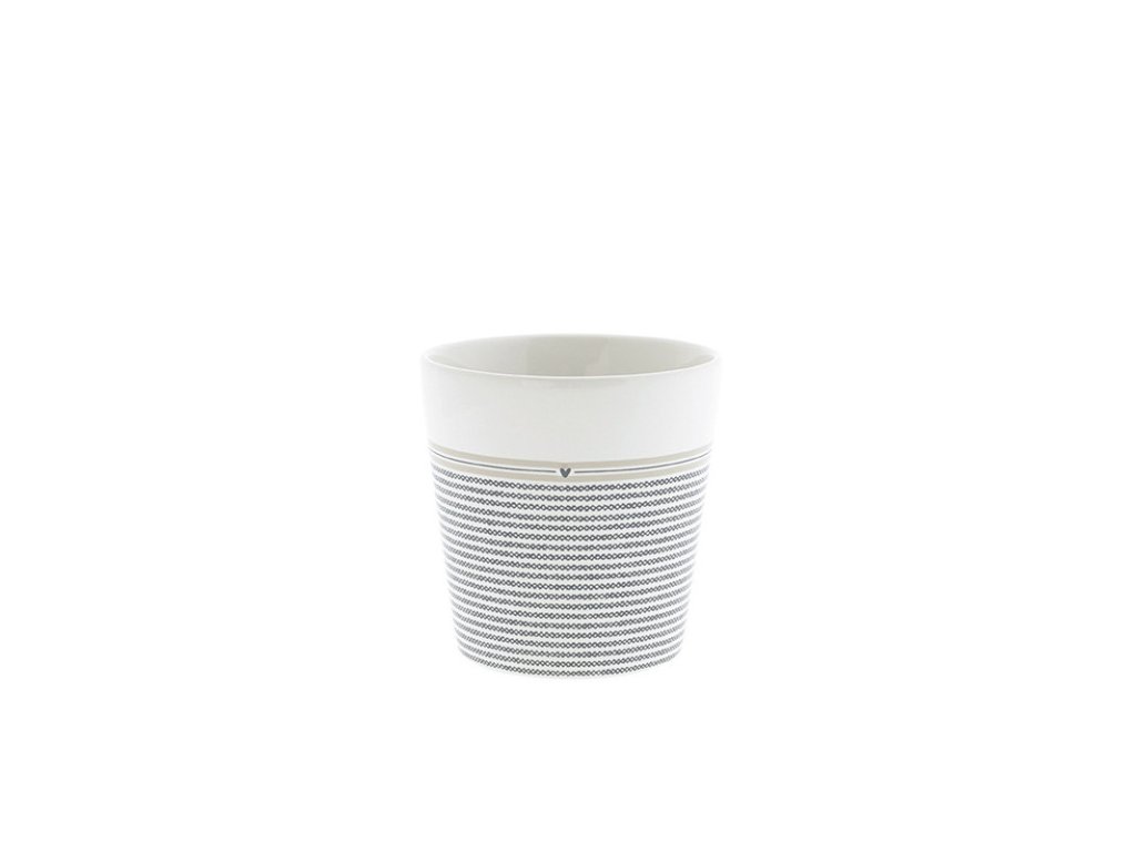 Tento půvabný hrneček z kolekce Bastion Collections v sobě nese dokonalou rovnováhu mezi minimalismem a jemnou romantikou. Na čistě bílém podkladu se střídají jemné horizontální proužky v přírodních tónech, které doplňuje malé černé srdíčko – symbol laskavosti a klidné energie.