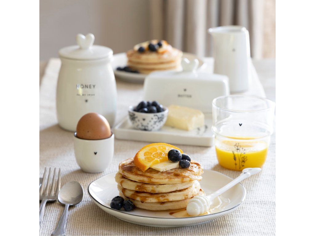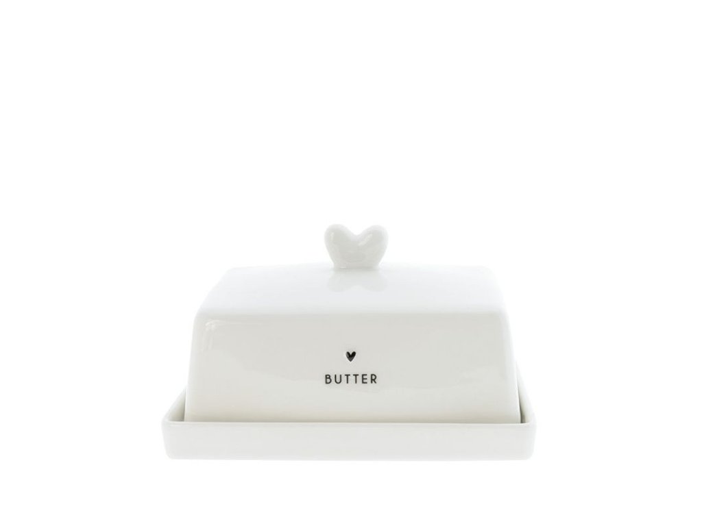 Tato keramická máslenka spojuje praktický design s jemnými, romantickými detaily typickými pro značku Bastion Collections. Černý nápis Butter a srdíčkem na víčku dodávají kousku charakter a šarm, díky čemuž se stává nejen funkčním, ale i dekorativním doplňkem vaší kuchyně či jídelního stolu.🖤