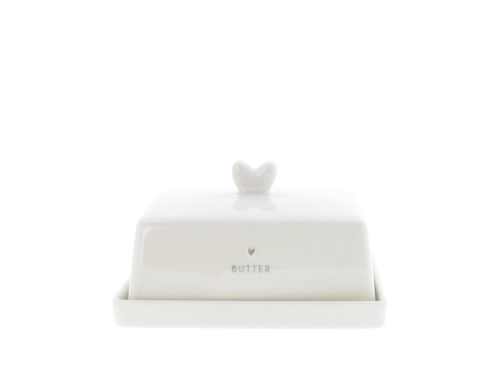 Stylová máslenka Bastion Collections v elegantní bílé barvě s jemným šedým lemováním a srdíčkem na víčku. Praktický i dekorativní doplněk vaší kuchyně, který dodá servírování másla nádech útulnosti a čistého designu.