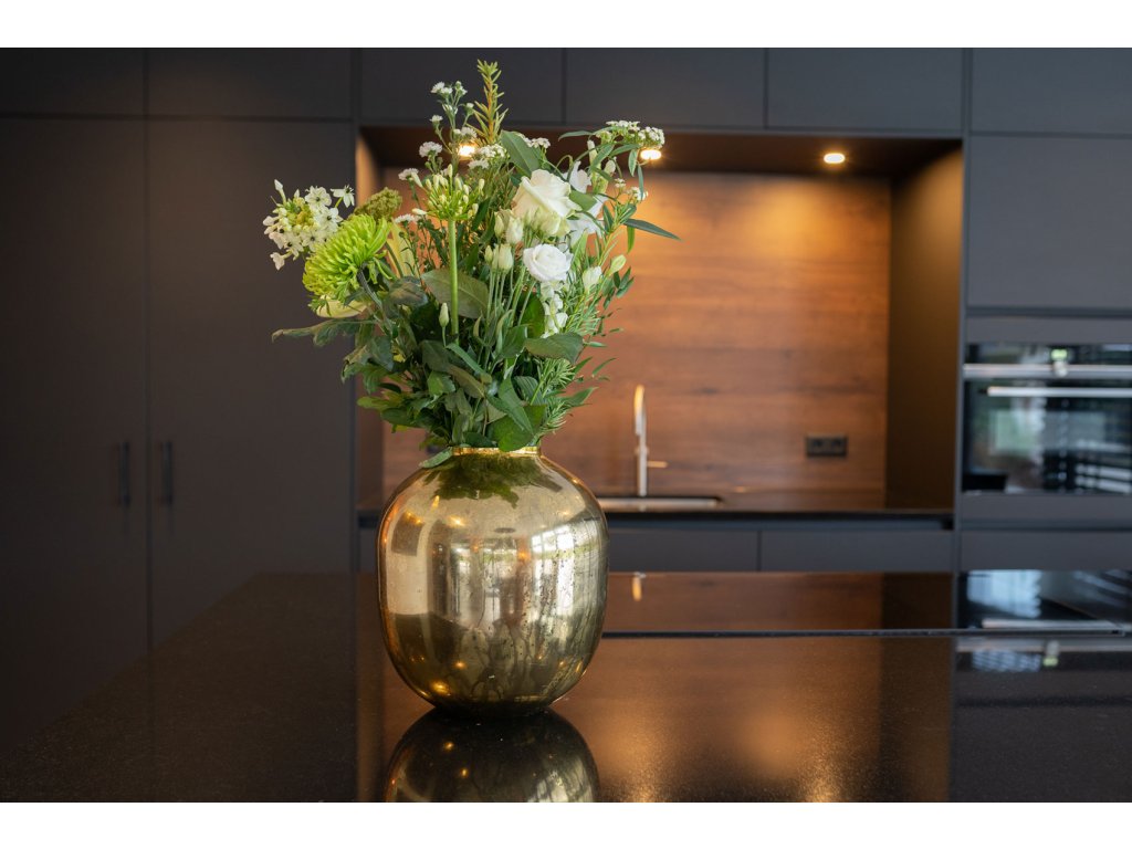 Díky rozměrům D26 × H30 cm je váza ideální do prostornějších interiérů – obývacího pokoje, vstupní haly, jídelny nebo hotelového typu interiéru. Skvěle se hodí pro aranžmá z eukalyptu, sušených travin, větví nebo luxusních květin, které podtrhnou její výrazný charakter.